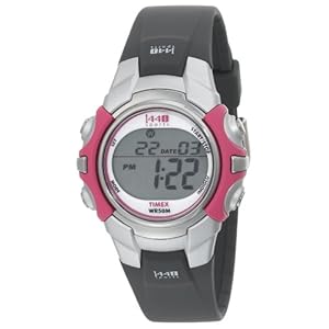 This mid-sized Timex Sports digital watch (model T5J151) features a durable pink and silver resin watch case with easy-to-access side buttons and quickly readable large digital display. Sport timing features include a 24-hour chronograph and 24-hour countdown timer. Other features include a daily alarm, dual time zone display, and water resistance to 50 meters (165 feet). It's completed by a comfortable gray polyurethane strap with a tapered profile.This Timex Watch (but not any battery, crystal, band, or strap) is warranted to the owner for a period of ONE YEAR from the date of purchase against defects in manufacture by Timex Corporation. Timex will not repair defects relating to servicing not performed by Timex Corporation. This limited warranty applies to US Customers.